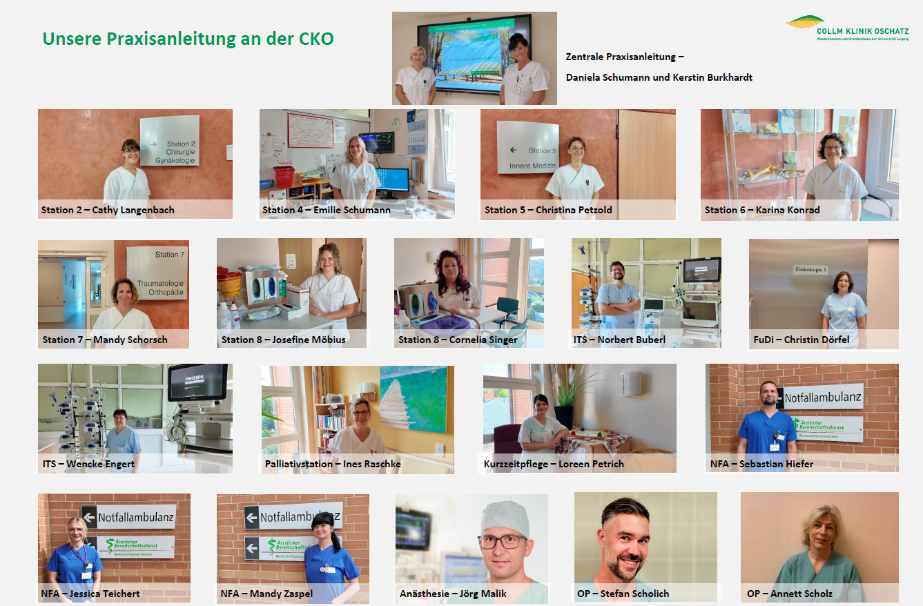 Die praktische Ausbildung startet mit einem Orientierungseinsatz an der COLLM KLINIK OSCHATZ. Weitere Pflichteinsätze erfolgen in den Bereichen: